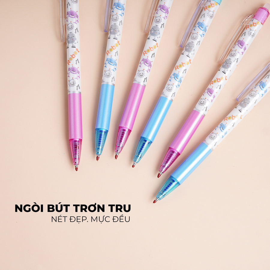 - Nét bút trơn, đều mực, đậm nét , không chảy mực, nắp và hai đầu kín bảo vệ bay mực tối ưu, là sản phẩm đầu bi với công nghệ 2 bi Thụy Sỹ.