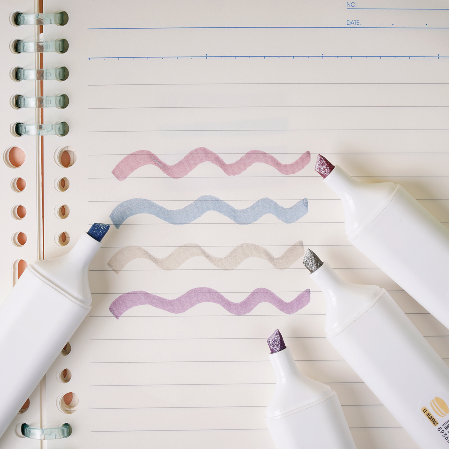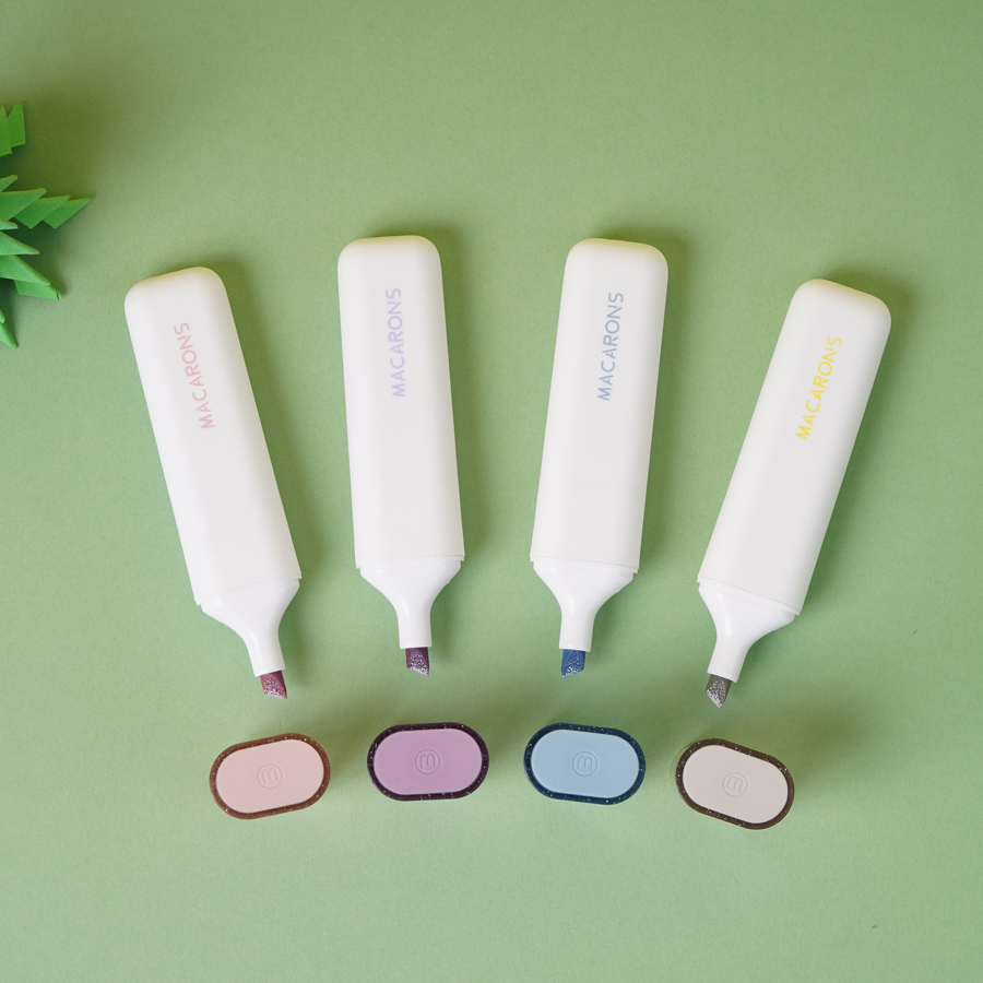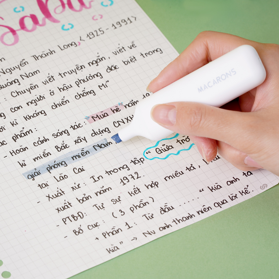 - Highlight Macarons đa năng: vừa có thể highlight đánh dấu, vừa viết calligraphy cơ bản, vừa tạo được các stiker trang trí sổ vở, có đầu ánh nhũ, có đầu doubleline 2 màu tiện lợi