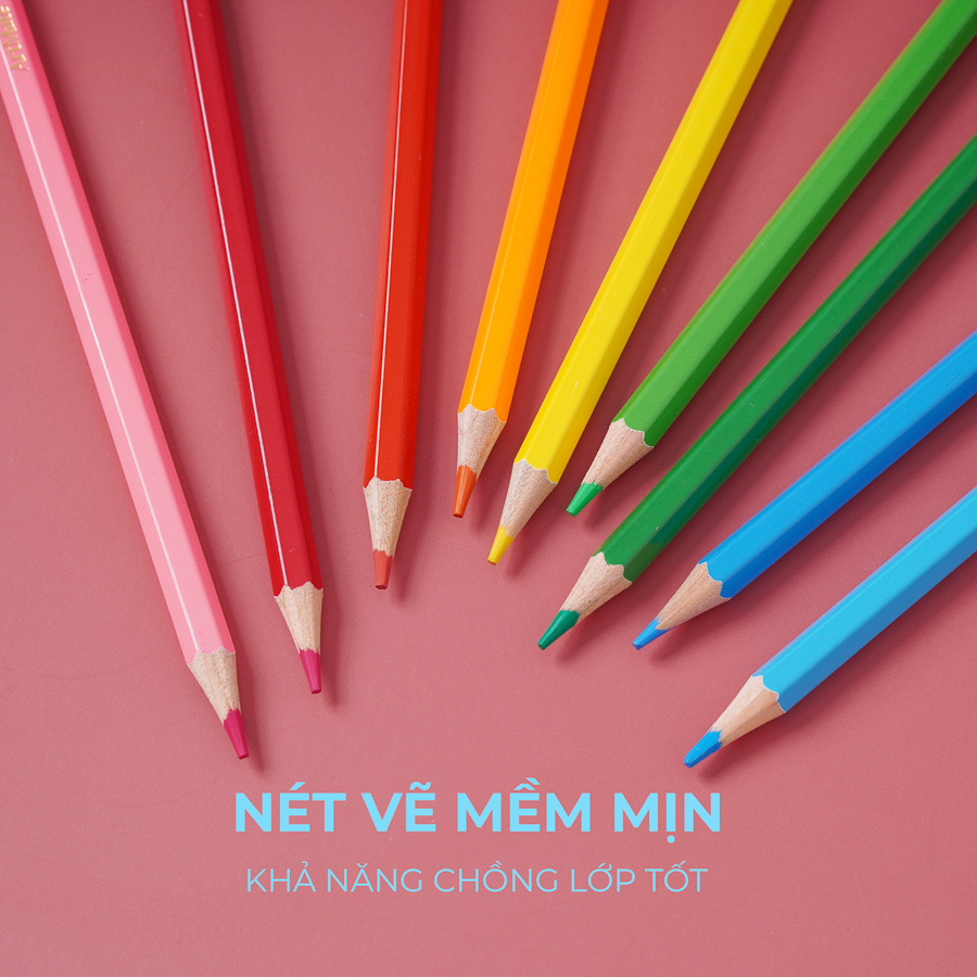 - Ruột chì cứng, dễ bám giấy, màu mịn đẹp, không bị gãy vụn, ít hao, ít tạo màu thừa, hạn chế làm bẩn tay và quần áo.