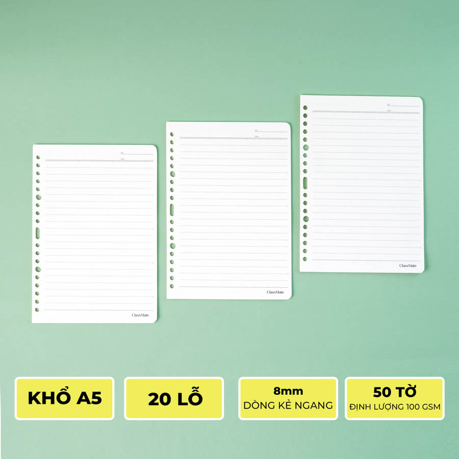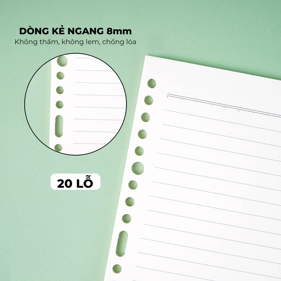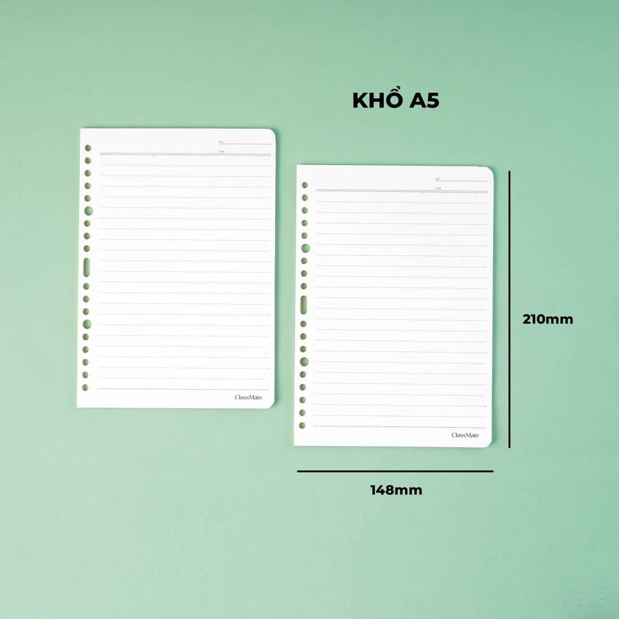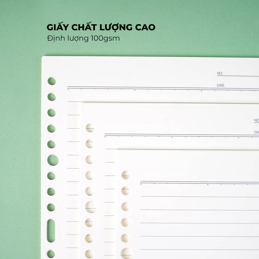 - Giấy có 2 kích thước B5 và A5 tương ứng là 26 lỗ và 20 lỗ thay thế được cho nhiều loại sổ còng binder khác nhau, dung giấy thay thế cũng giúp tiết kiệm hơn nữa.