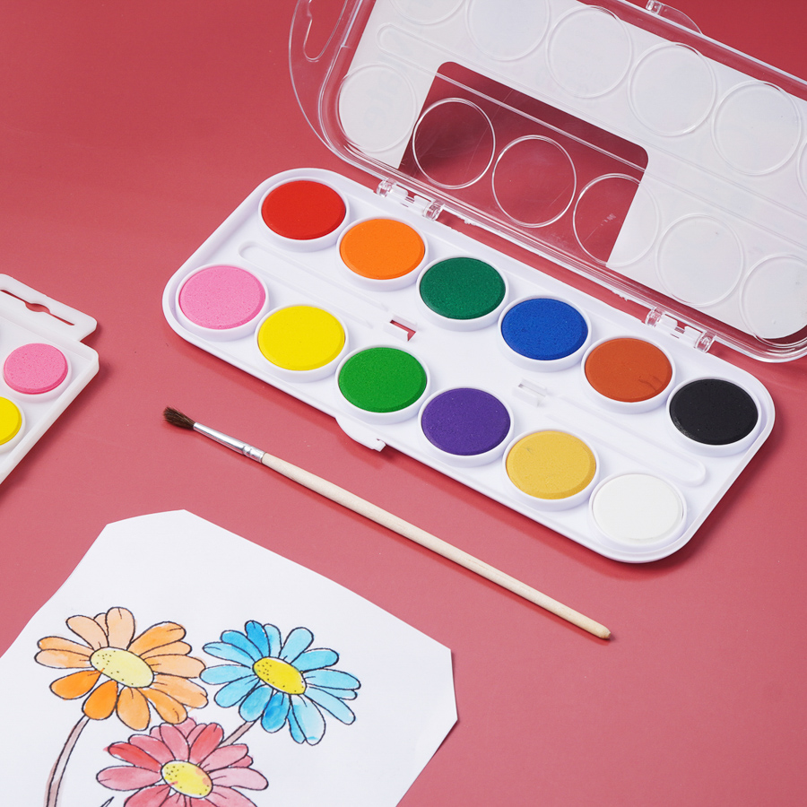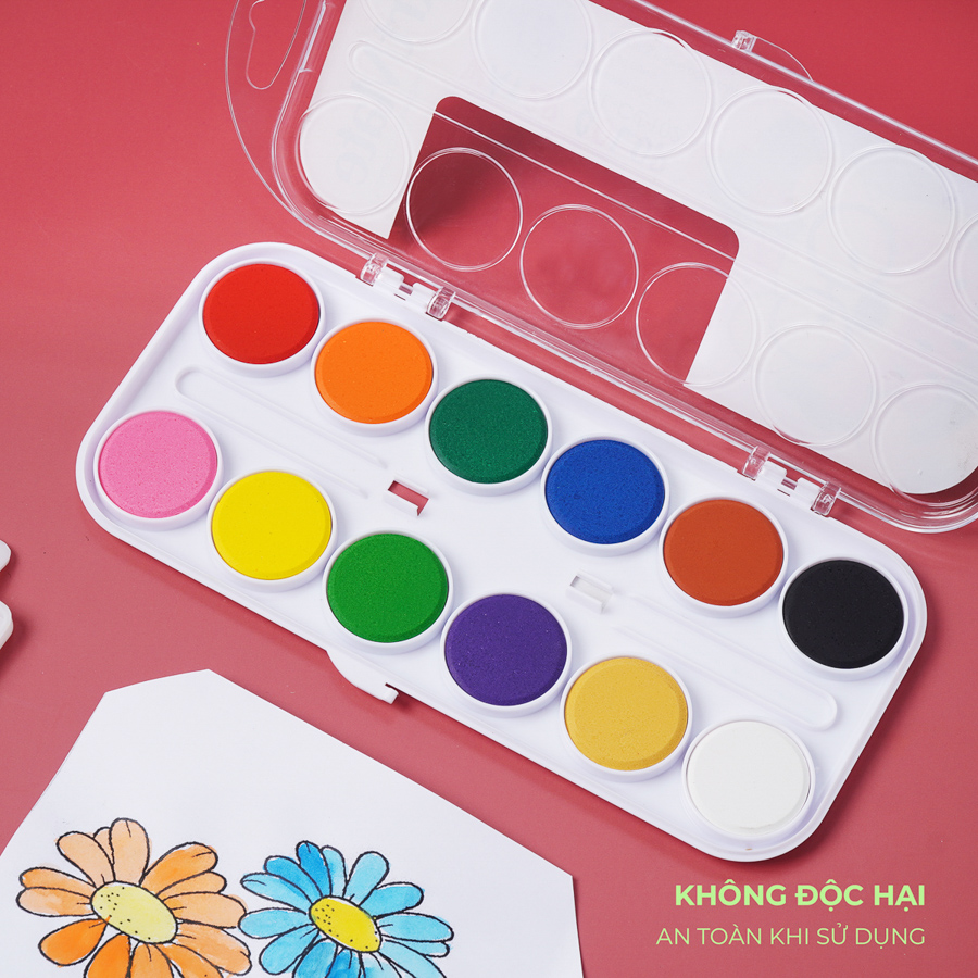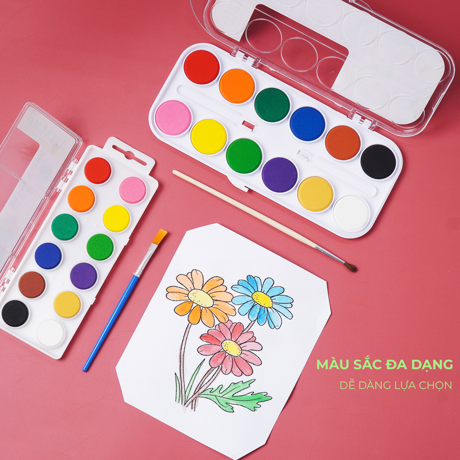 - Sản phẩm có độ bám giấy, độ phủ tốt, có thể chồng màu, pha trộn màu dễ dàng. Màu nước đi kèm một cọ nhựa giúp bé tô vẽ ý tưởng dễ dàng.
