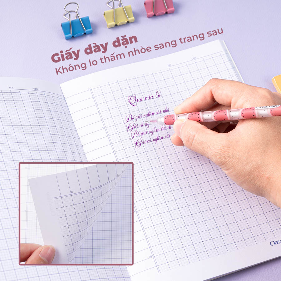 - Bề mặt giấy láng mịn, viết êm tay, không nhòe: Được sản xuất với định lượng giấy cao, chất liệu giấy dày dặn, không thấm hút, giúp bé dễ dàng luyện viết chữ. Bề mặt giấy trơn láng, không có cặn giấy.