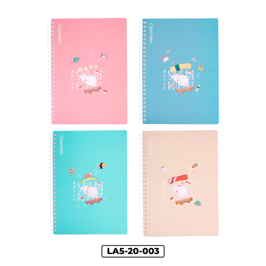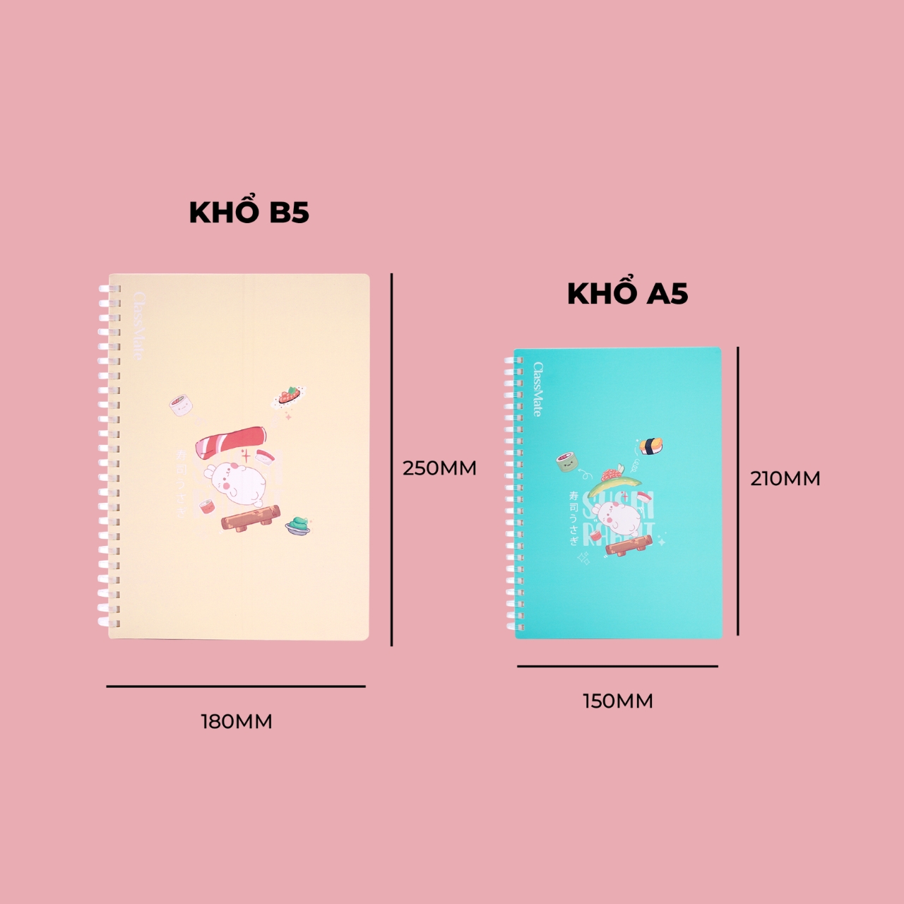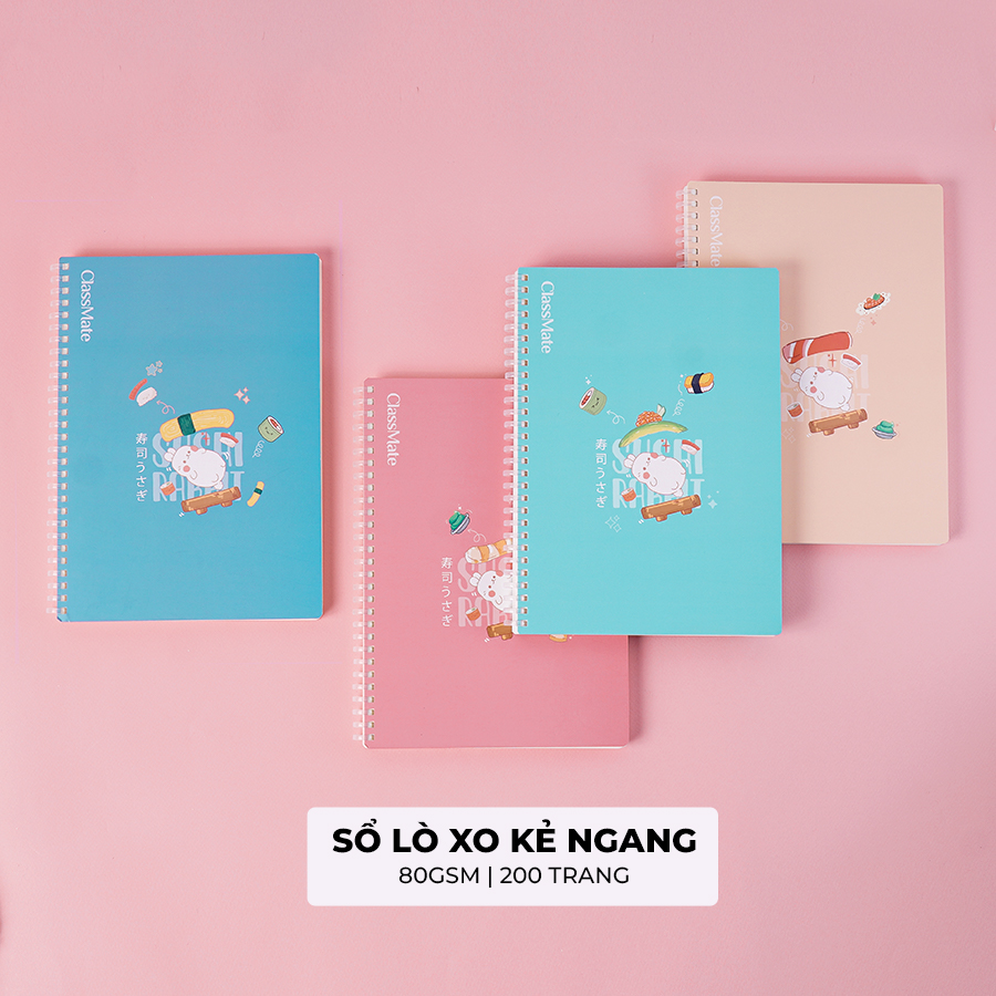 - Sổ lò xo nhựa Sushi cực kỳ dễ thương, 4 mẫu bìa là vị sushi khác nhau và đặc biệt phần cơm trong sushi sẽ được thay bằng hình ảnh của 1 chú thỏ xinh xắn
