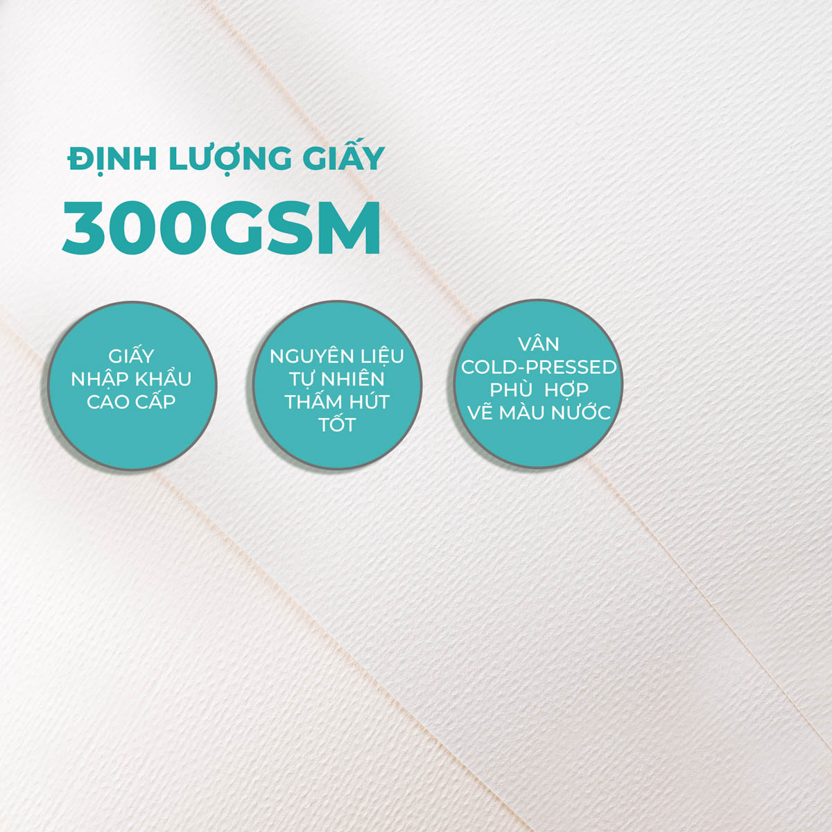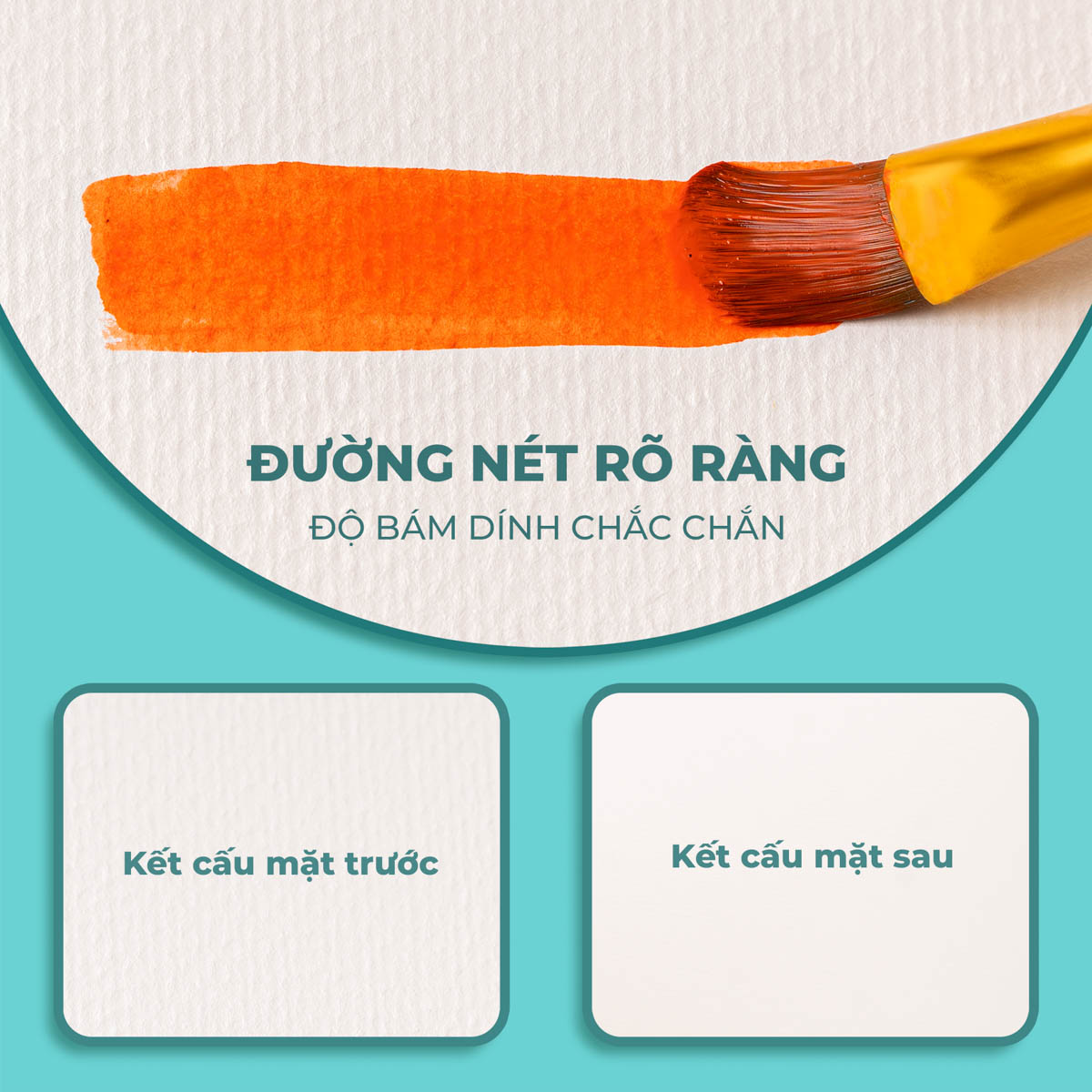 - Định lượng cao: 300gsm, có thể vẽ bằng nhiều chất liệu màu cũng không lo thấm sang mặt sau.
